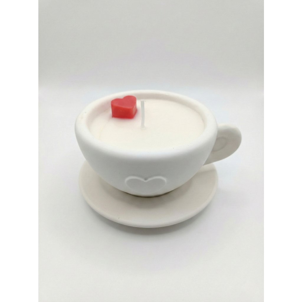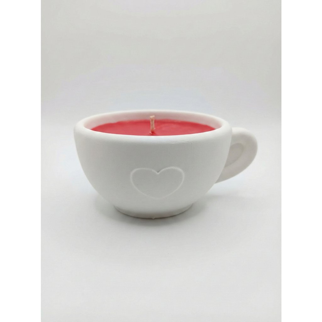 Svíčka je umístěna v keramickém šálku s podtáckem. Nejedná se o potravinu – svíčka slouží výhradně jako dekorace a není určena ke konzumaci.