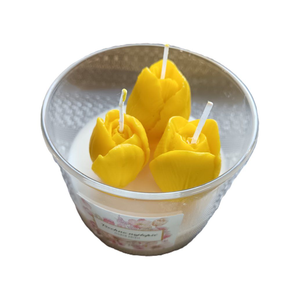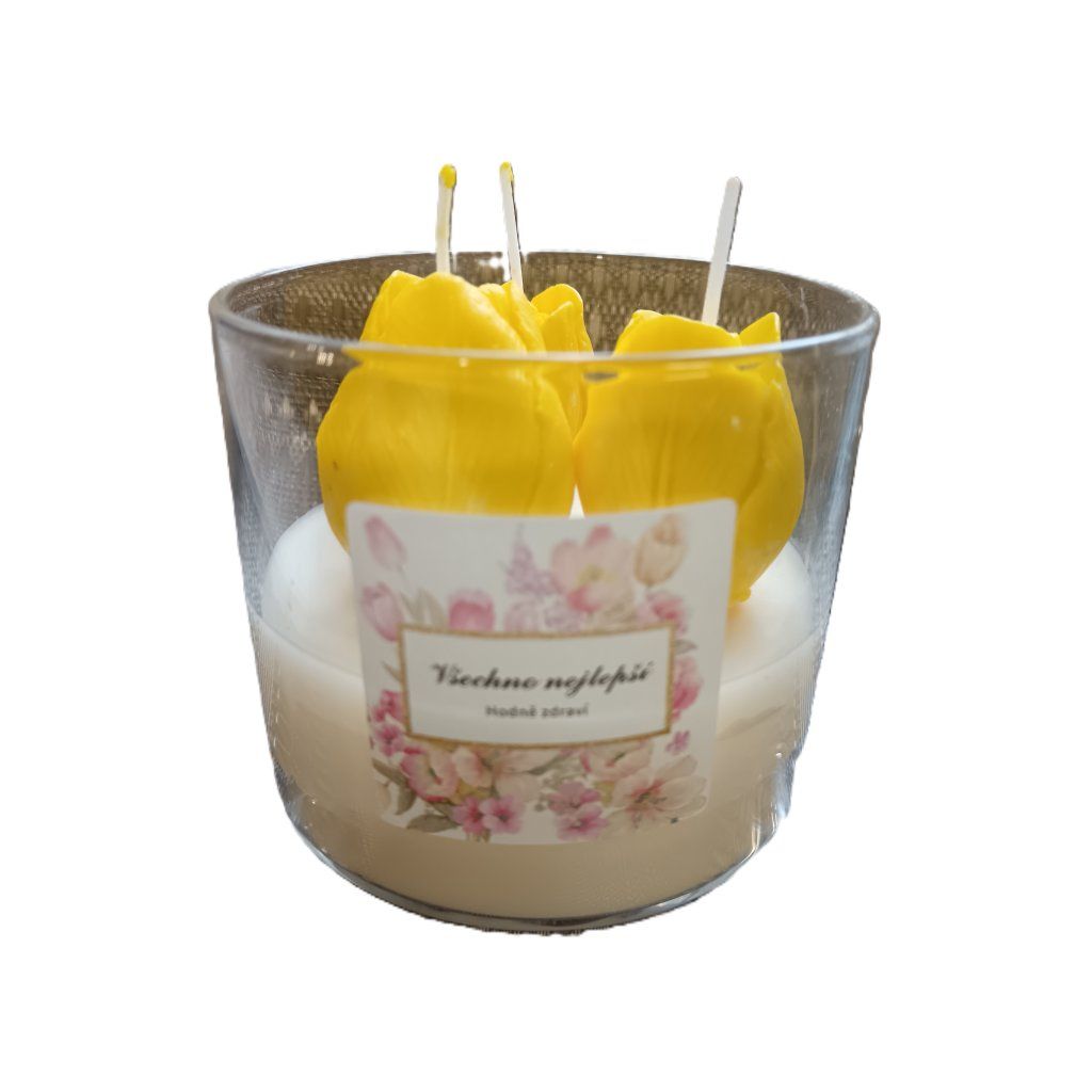 Tulipán ve skle je ručně vyráběná sójová svíčka ve skleněné nádobě s bambusovým víkem. Obsahuje bílý sójový vosk a tři barevné tulipány se svěží květinovou vůní s jemným onražovým nádechem.