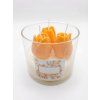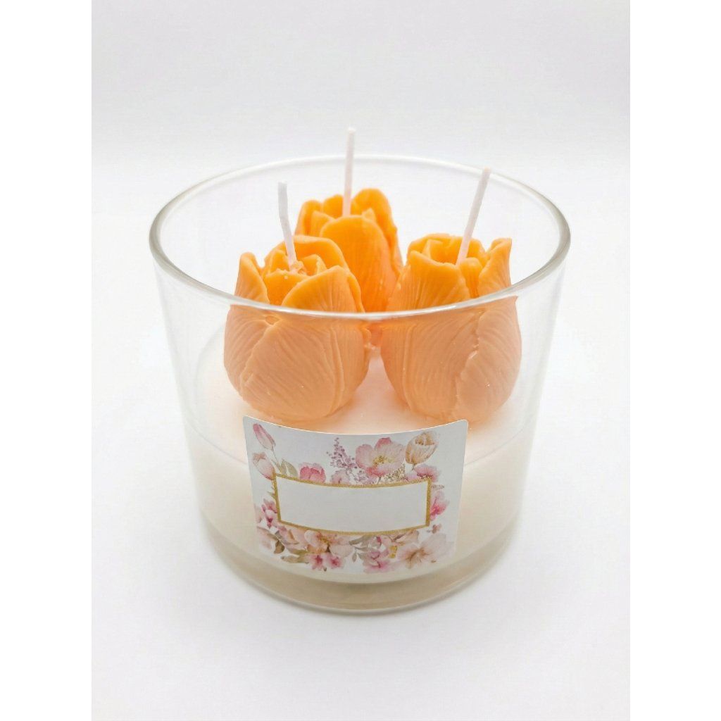 Sójová svíčka s tulipány ve skle v teplých oranžových a žlutých tónech se svěží květinovou vůní.