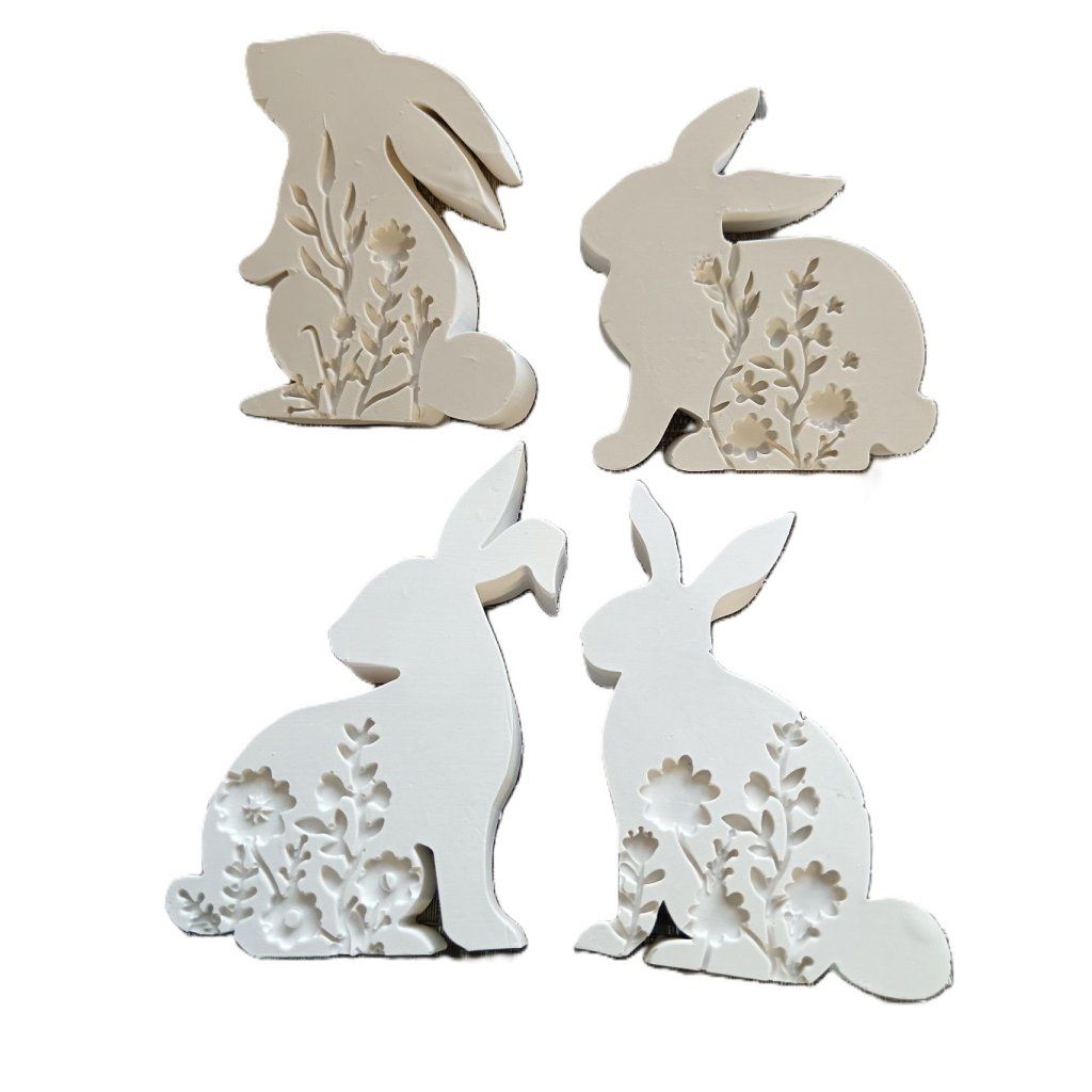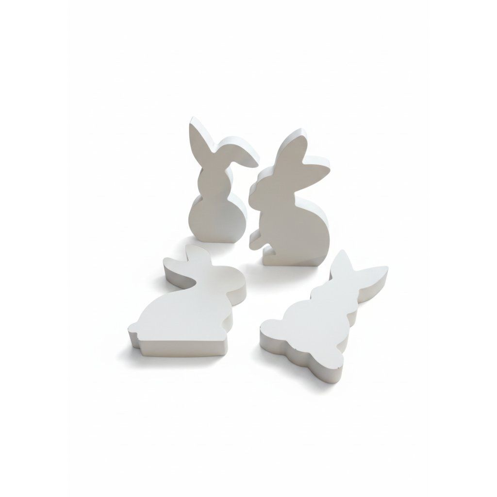 Sada 4 kamarádi a 4 krasavci - obsahuje 4 stojící 2D zajíčky o velikosti 10 × 8 × 1 cm. Celková hmotnost 500 g.Odlitky dobře stojí v prostoru a jsou vhodné do velikonočních výzdob i k venkovnímu použití.